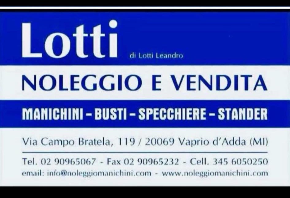 Uffici: tel 02 90965067 cell 345 60 50 250 Sede legale Esposizione e Magazzino: riceviamo su appuntamento via Campo Bratela 119 20069 Vaprio d'Adda (MI) cell 345 60 50 250 info@noleggiomanichini.com amministrazionelottil@pec.it